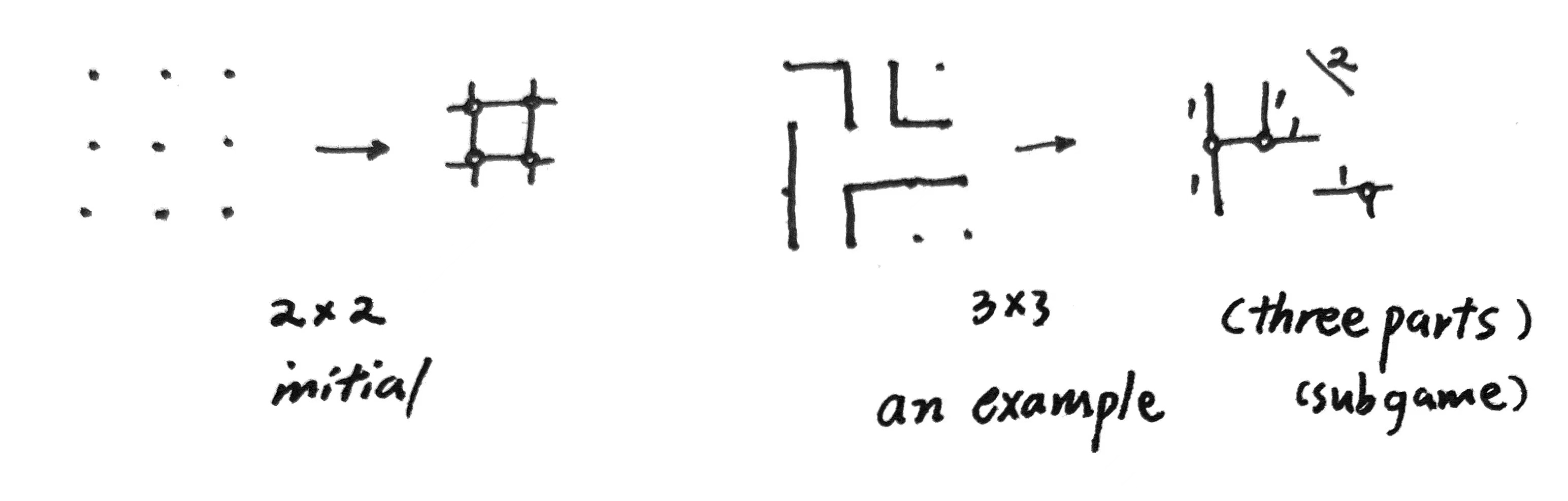 这是一个曾在我高中时流行的简单的纸笔小游戏。经过搜索叫做点格棋 Dots and Boxes,由法国数学家Lucas在1891年推出(原本以为没名字,自己取了中文名划线围格和英文名Grid Enclosing)(失望的发现已经是一个经典的Computer Games项目了,但还是坚持完成本篇吧)。游戏进程如下:有 $n \times n$ 大小的网格,双方玩家互相沿着某一条直线划线(一次划一个单位小格的边),当某块区域被合拢围起来时,内部格数归最后一笔合拢的玩家所有,此时该玩家必须再走一步棋(直至没有产生围格为止)。到最后棋面被完全瓜分成若干个完整区域(最外的边线也要一笔笔划上),计算玩家得分(所占格数)判断胜利。