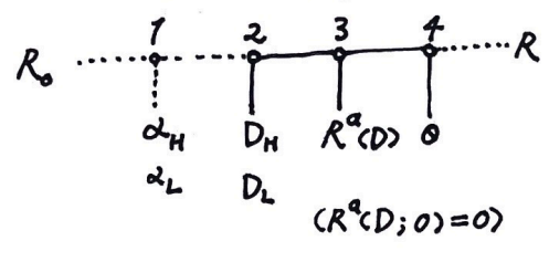 以上 $R_0, \mu, \alpha_{H/L}, \beta_{H/L}, w, R_w, \tau, \eta, \gamma$ 均为共同知识。我们这里假设了很多线性形式,可以料到最值会处在两极。