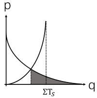 最后产业部分应该可以有很多经济学等可以讨论的话题;这里只来点传统的分析,使用简单的 Marshallian cross。注意到玩家的剩余效用与图上的阴影面积 $\Delta$ 成正比(向纵轴投影即可),此外加上销售技术的利益(同样正比于阴影面积),玩家的意愿价格可表示为 $m\cdot \Delta$,$m$ 为一系数。(值得讨论,但我觉得偏差不大。)将不同玩家的总游戏时间(满足 $u(T)=\epsilon(T)-A,\ T<T_s$)横向加总即可得到一款游戏的需求曲线。供给侧的游戏厂家并不只是面对游戏价格 $P$,而包括对内的玩家充值(如前所述)、对外的广告服务(与 $Q$ 有关),以及衍生产业的周边产品等(可视作对需求曲线下方剩余的进一步攫取)。这样得到的供给与需求函数和市场结构一起形成了游戏市场的局部均衡分析。
