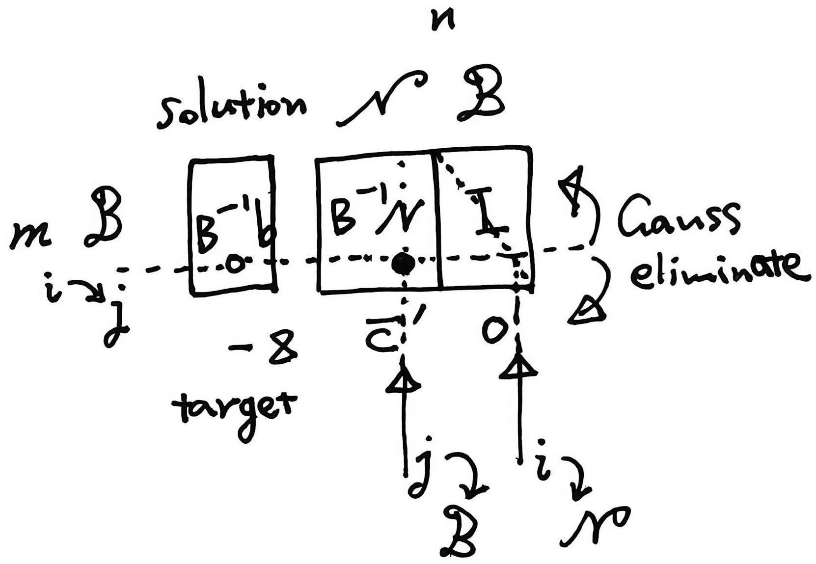 线性目标函数在凸可行域上一定有顶点为最优解。这些顶点用基变量 $x_B\in \mathbb{R}^m$ 记载($A \in \mathbb{R}^{m\times n}$,$m<n$),即从 $x$ 下标集 $\{1,\dots,n\}$ 中选取 $m$ 个非零分量,剩余 $n-m$ 个分量为 $0$。$AP=[B, N],\ Px={x_B \brack x_N}$,$x_B = B^{-1}b - B^{-1}Nx_N$。