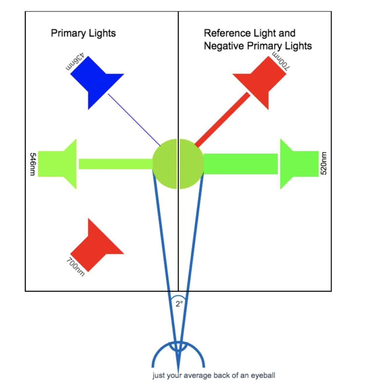 事实上,WG 二人原始使用的基色均不为 NPL 标准基色($\lambda_r$ = 700 nm 的红光,$\lambda_g$ = 546.1nm 的绿光,$\lambda_b$ = 435.8 nm 的蓝光,他们通过一点合成变换的方式让实验近似为 NPL 标准基色做的那样(感兴趣可参考 [1-3])。