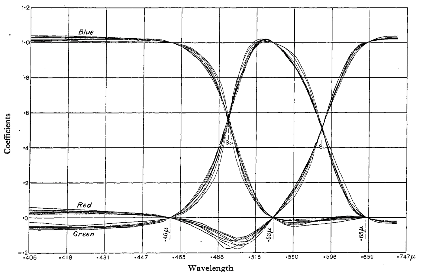最终得到了光谱色度系数 $r(\lambda),g(\lambda),b(\lambda)$(且 $r(\lambda)+g(\lambda)+b(\lambda)=1$),Wright 的曲线原稿见图。