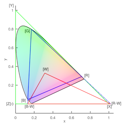 - 色域完全包含于 $\hat{x}(1,0),\hat{y}(0,1),\hat{z}(0,0)$ 围成的三角形里。