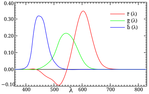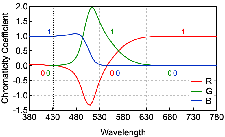 注意负数是因为我们发现有些颜色光靠相加无法匹配,故在测试光这一侧添加一定基色光以进行匹配,移项后记负值。