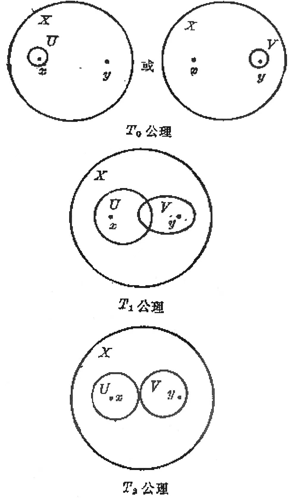 可数公理 分离公理 ($C_1$: 序列 ex. 度量;$C_2$: 可分 ex. 可分度量) ($T_1$: 单点闭;$T_2$: 网收敛于同一点;$T_4$: ex. 度量)